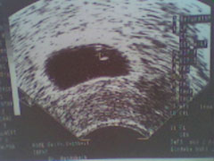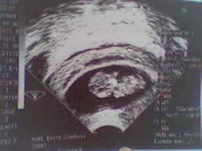 Önnur myndin af litla krílinu, 1. september 2005, vika 8 +1. Ef þú skoðar vel, þá sérðu litlu valhnetuna í neðri hlutanum af dökka svæðinu (legvatninu) og krílið er sitjandi. Semsagt, hausinn up, botninn niður. =) Krílið var 16 mm frá haus niður að rassi, sem er alveg á áætlun. Við sáum líka handleggina og fótleggina, en myndin sýnir það ekkert sérstaklega vel.