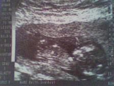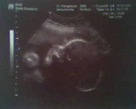 Þriðja myndin, 15. september, 2005, vika 10 + 1. Litla höfuðið er til vinstri og búkurinn til hægri og maður sér litlu handleggina líka =). Krílið var steinsofandi og lét sko ekki trufla sig, en litla hjartað var alveg á fullu. Krílið er núna 33 mm og alveg á áætlun!
